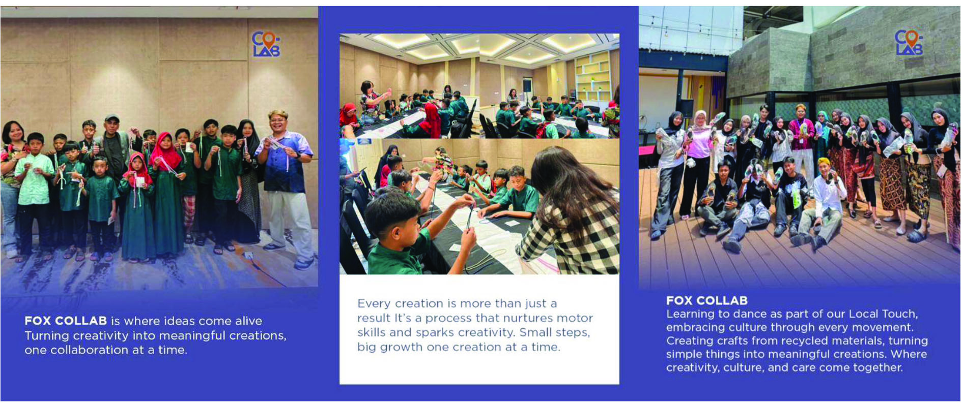 Melalui rangkaian kegiatan ini, FOX COLLAB berharap dapat memberikan pengalaman yang berkesan sekaligus membangun kesadaran akan pentingnya kreativitas, budaya, dan kepedulian terhadap lingkungan sejak usia dini.