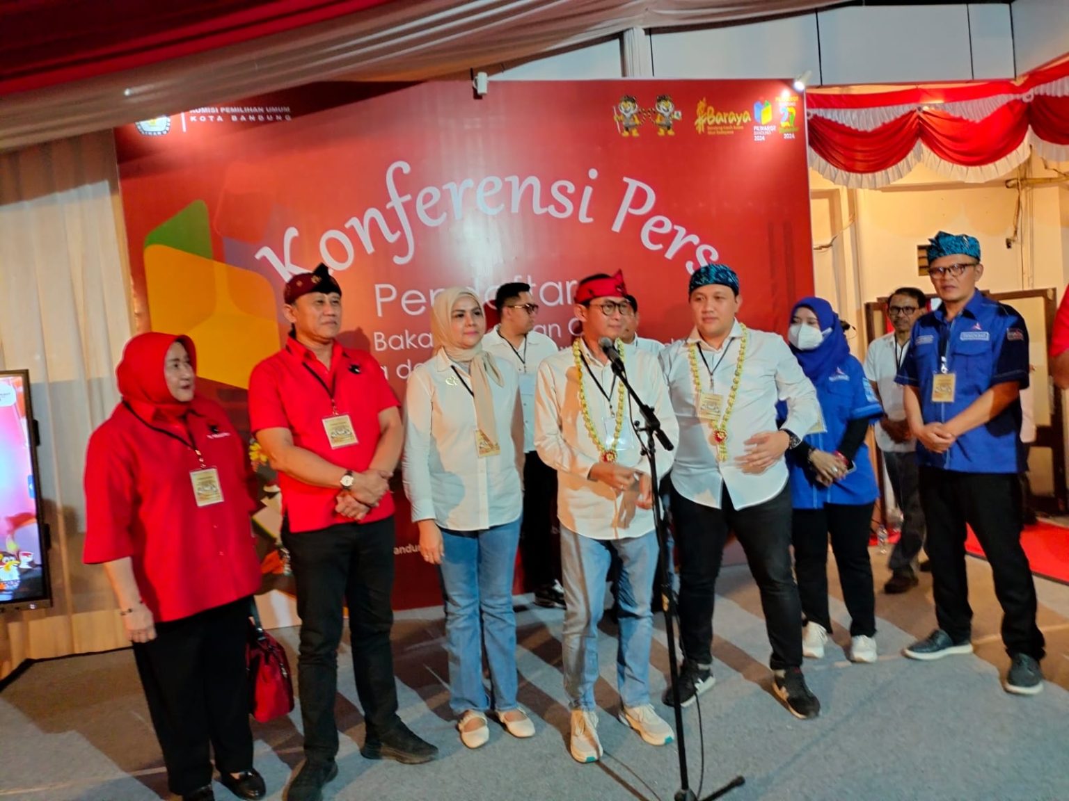 BANDUNG – Pasangan calon wali kota dan wakil wali kota Bandung 2004 – 2029 diusung PDIP dan Demokrat yakni Dan Dan Riza Wardana dan Arif Wijaya mendaftar di detik-detik terakhir pendaftaran ke Komisi Pemilihan Umum (KPU) Kota Bandung, Kamis (29/9/202) malam.